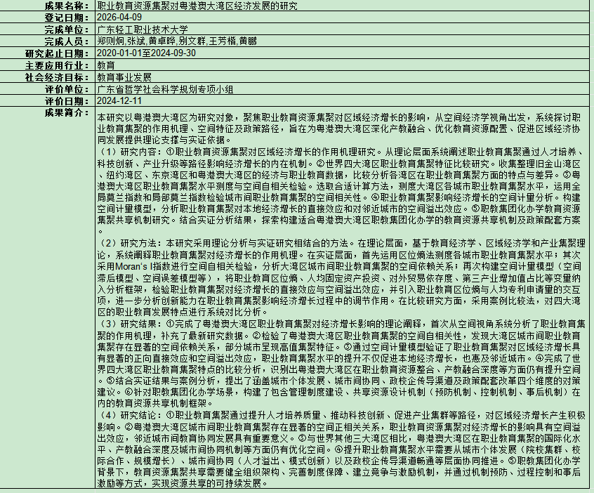根据国家《科技成果登记办法》有关规定,现将我单位《职业教育资源集聚对粤港澳大湾区经济发展的研究》成果登记相关信息予以公示。