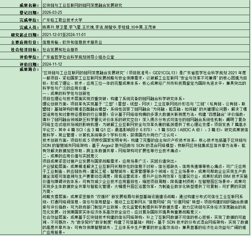 根据国家《科技成果登记办法》有关规定,现将我单位《区块链与工业互联网的链网深度融合发展研究》成果登记相关信息予以公示。