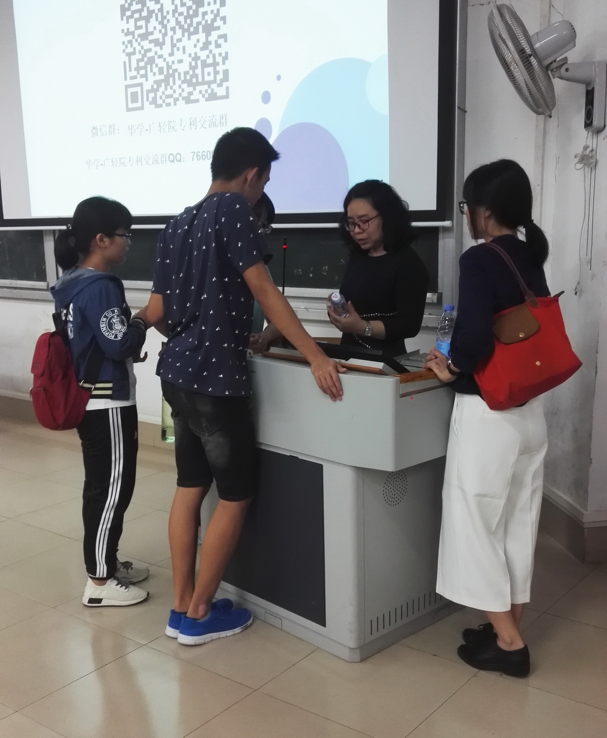 梁莹讲师通过“博士与农民”的小故事提起在场的学生们对知识产权的兴趣并引发深思,之后又通过列举多个示例深入浅出地向同学们介绍什么是知识产权、创新创意可以申请什么类型的专利、通过知识产权纠纷案例告诉同学们知识产权保护的重要性、学生申请专利带来的好处以及学生在申请专利应当注意事项等方面的知识,提高同学们对创新成果的知识产权保护意识,激发学生们投身科研实践、开展创新创造的热情。在培训结束后,学生们还意犹未尽,结合自身学习、研究课题及成果如何申请专利的问题,纷纷上前积极向梁莹讲师请教,并进行深入的探讨,现场的气氛非常活跃,梁莹讲师热情、耐心解答了学生的各种疑问。