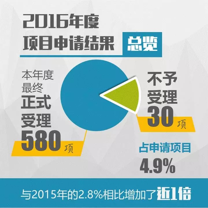 最终本年度正式受理580项,不予受理30项,不予受理项目占申请项目的4.9%,与2015年的2.8%相比增加了近1倍。