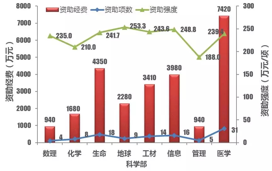 各科学部重点合作研究项目资助经费(直接费用)、资助项数及资助强度见图1。