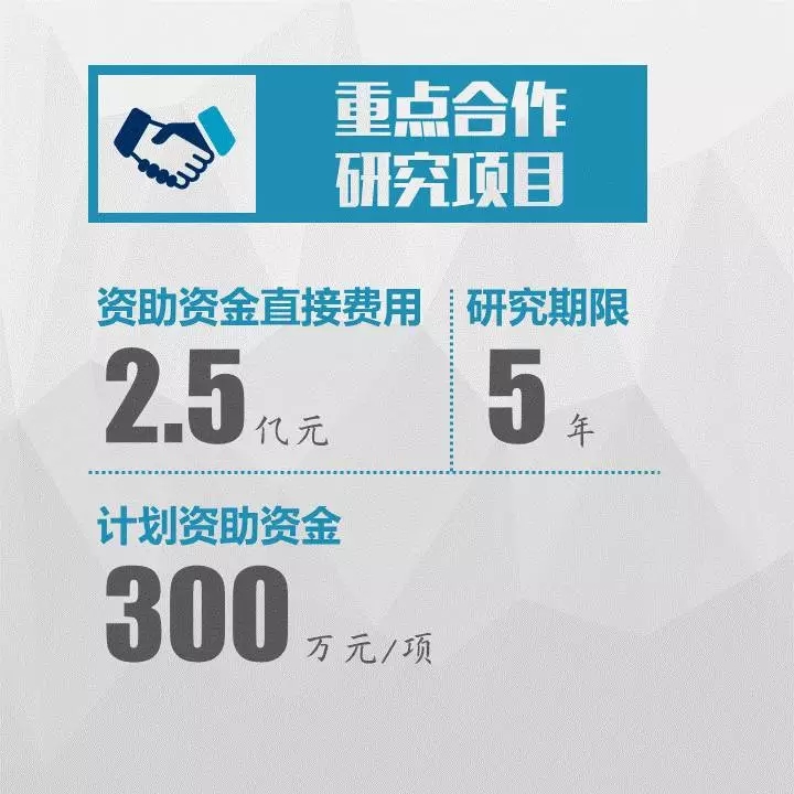 2016年度重点合作研究项目资助资金直接费用为2.5亿元,计划资助资金为(300万元/项),项目研究期限为5年。