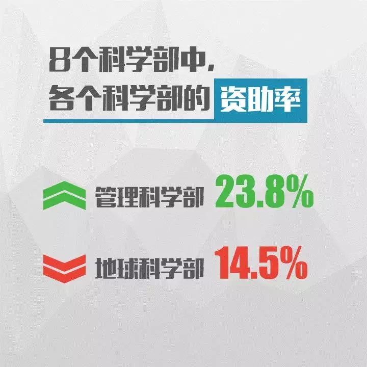 8个科学部中,管理科学部的资助率相对较高,为 23.8%。地球科学部的资助率最低,仅为14.5%。