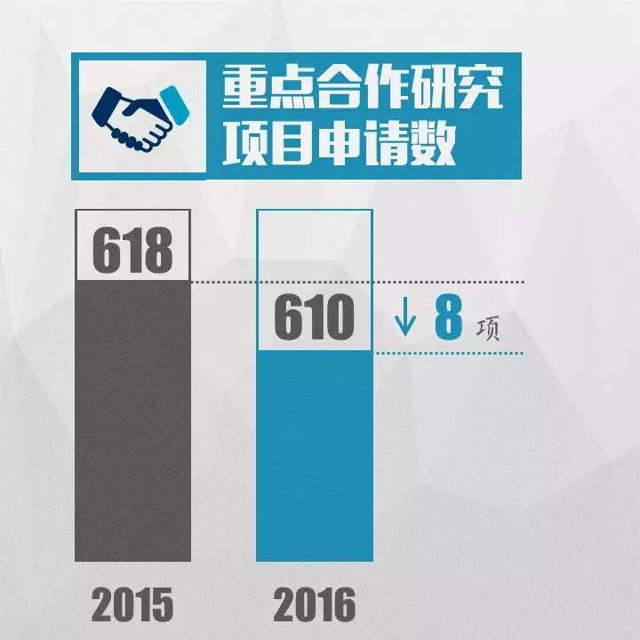 2016年国家自然科学基金委员会(以下简称“基金委”)共收到重点合作研究项目申请610项,比2015年的618项减少了8项。