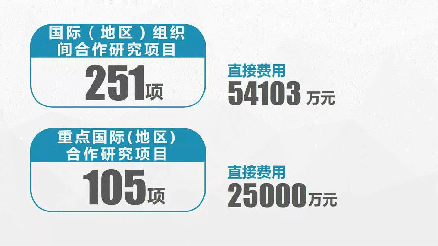加强组织间双边合作与交流,资助国际(地区)组织间合作研究项目251项,直接费用54103万元。持续推进实质性国际合作研究,资助重点国际(地区)合作研究项目105项,直接费用25000万元。
