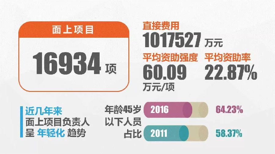 资助面上项目16934项,直接费用1017527万元,平均资助强度60.09万元/项,平均资助率22.87%。近几年来,面上项目负责人呈年轻化趋势,2016年,年龄45岁以下的占64.23%,比“十二五”初(2011年)的58.37%增长近6个百分点。