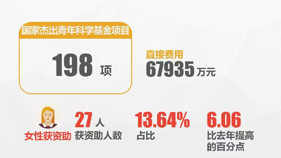 资助国家杰出青年科学基金项目198项,直接费用67935万元。其中,女性获资助27人,占13.64%,比去年的7.58%提高6.06个百分点。
