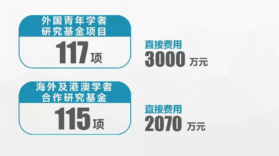 加大对外国青年学者的吸引力度,资助外国青年学者研究基金项目117项,直接费用3000万元。资助海外及港澳学者合作研究基金两年期资助项目115项,直接费用2070万元;