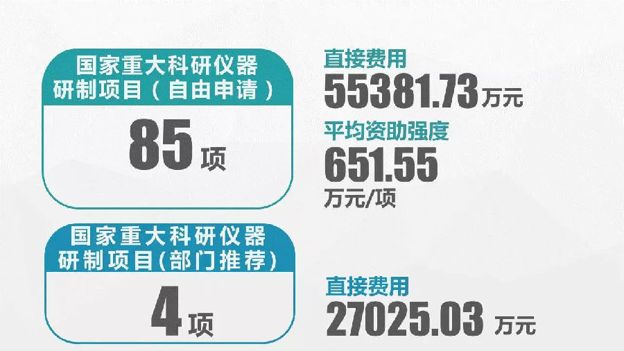 资助国家重大科研仪器研制项目(自由申请)85项,直接费用55381.73万元,平均资助强度651.55万元/项;资助国家重大科研仪器研制项目(部门推荐)4项,直接费用27025.03万元。