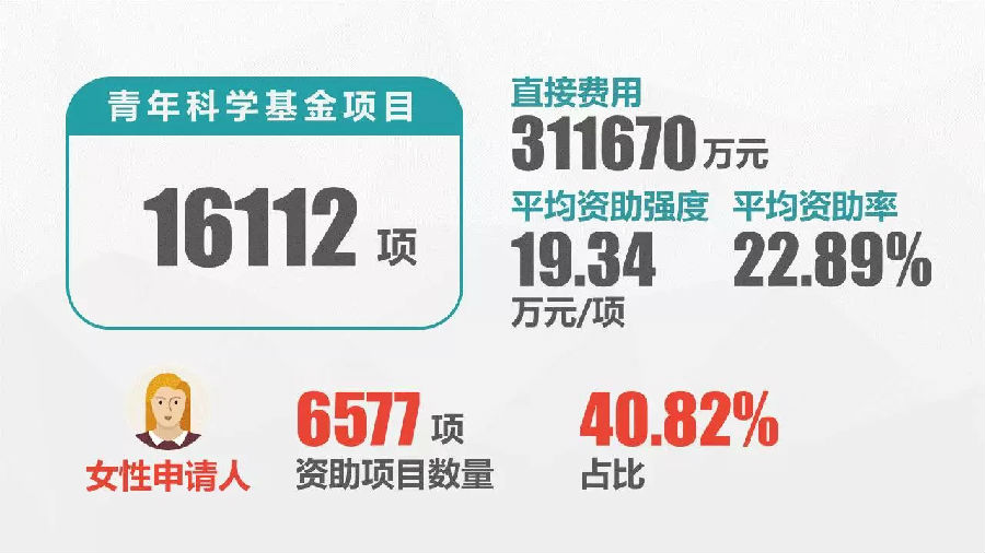 资助青年科学基金项目16112项,直接费用311670万元,平均资助率22.89%,平均资助强度19.34万元/项。其中,女性申请人资助6577项,占40.82%。