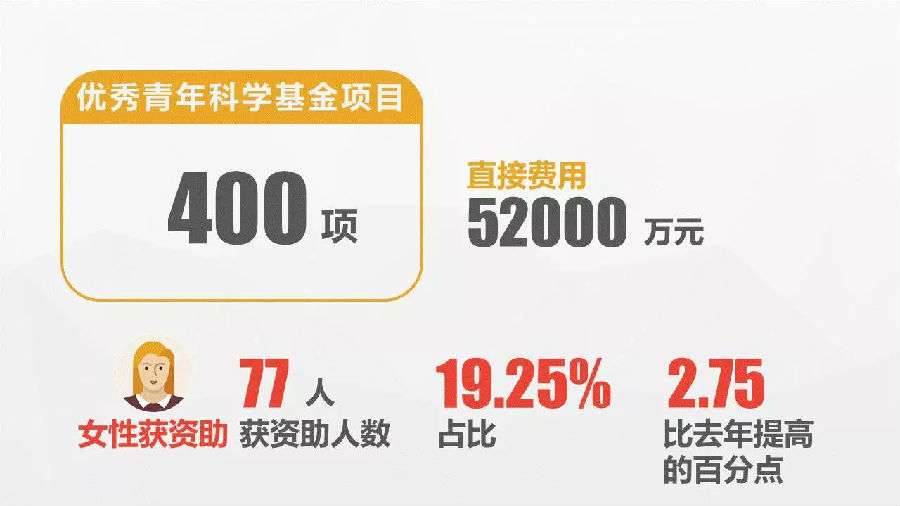 资助优秀青年科学基金项目400项,直接费用52000万元。其中,女性获资助77人,占19.25%,比去年的16.50%提高2.75个百分点。