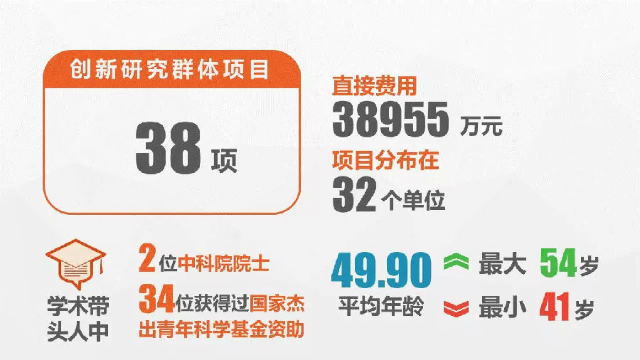 资助创新研究群体项目38项,直接费用38955万元。38项分布在32个单位。其中,学术带头人中2位为中科院院士,34位获得过国家杰出青年科学基金资助;平均年龄49.90岁,其中最大54岁,最小41岁。为推动学科深度交叉融合,探索对跨部门、跨单位、跨学科的人才团队的资助模式,基金委试点启动实施基础科学中心项目,共资助首批3个基础科学中心项目,资助直接费用51170万元。