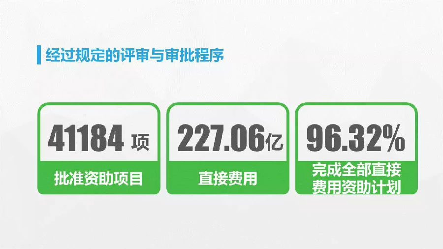 经过规定的评审与审批程序,批准资助项目41184项,直接费用227.06亿元,完成全部直接费用资助计划的96.32%。